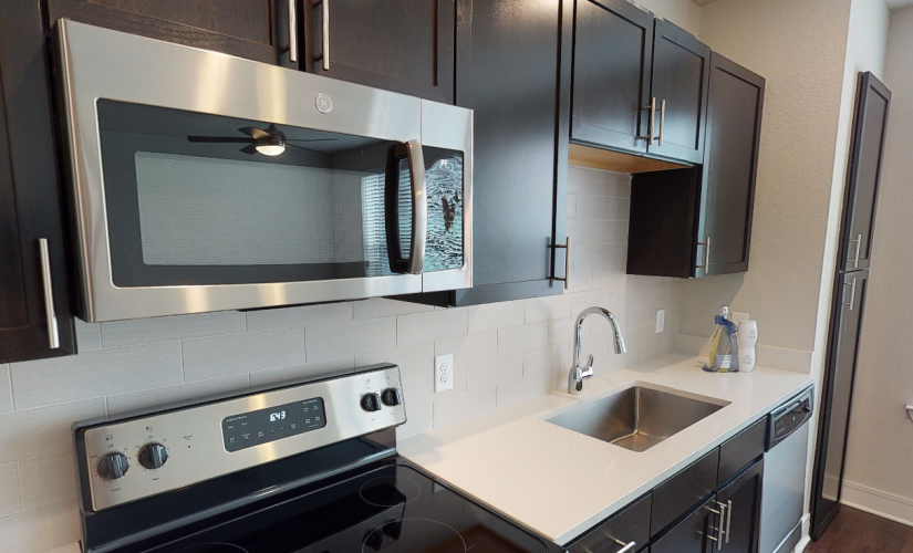 a kitchen with black cabinets